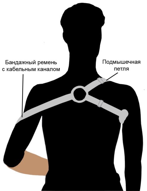 Тяговый бандаж предплечья Б-2Г предназначен для управления раскрытием рабочей насадки или кисти тягового протеза предплечья.